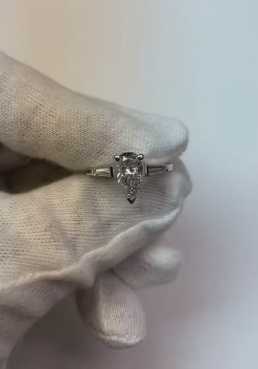 Stone Specifications: There is one pear cut diamond of approx. 1.51 carats (approx. size 8.7 x 5.7 mm) & 2 tapered baguettes of approx. 0.30 carats each. Natural earth mined diamonds.