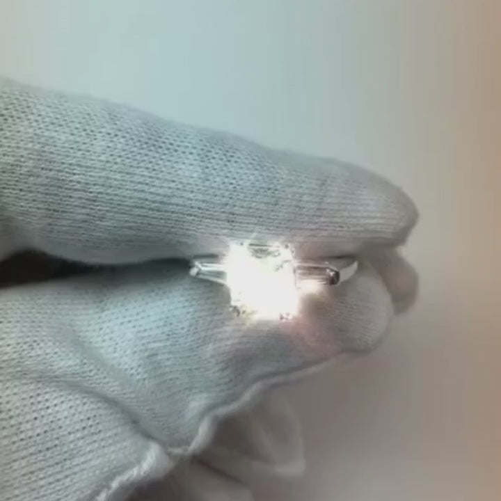 Stone Specifications: There is one radiant diamond in the center of approx. 2.51 carats & 2 baguettes of approx. 0.30 carats each. Natural earth mined diamonds.