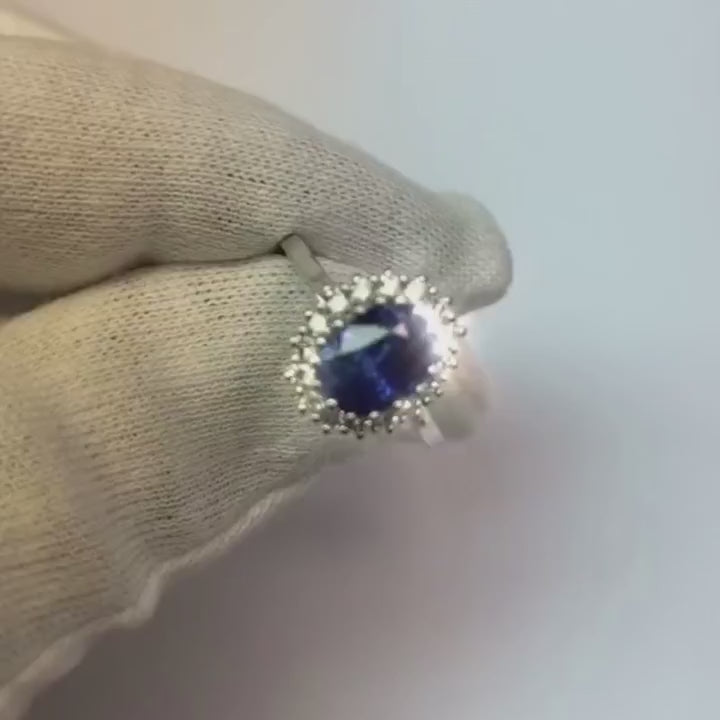 3.5 Ct Oval Shaped Ceylon Sapphire Round Natural Earth Mined Diamond Ring White Gold 14K