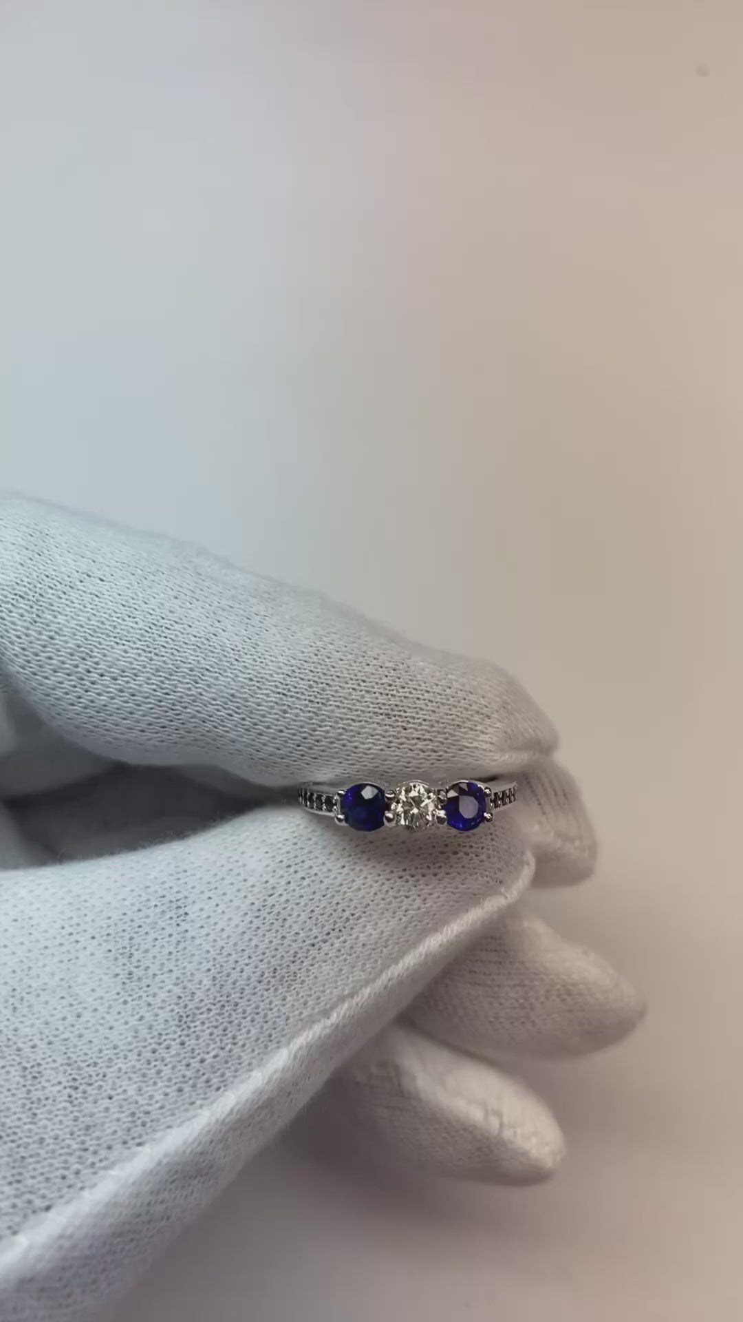 Stone Details : There is one center diamond, two blue sapphires approx. 0.25 carats each and small sapphires approx. 0.32 carats. Natural earth mined stones.
