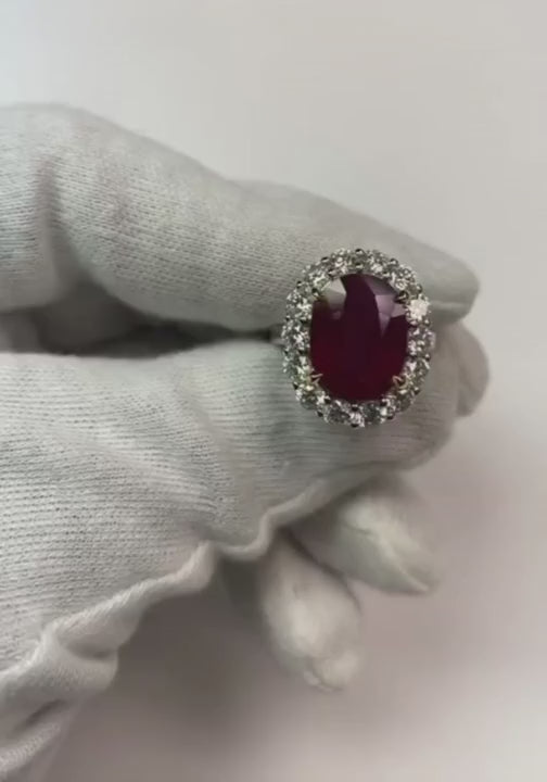 Stone Details : There is one ruby in the center approx. 4.50 carats and approx. 2.50 carats of smaller round diamonds on the sides. Natural earth mined stones.