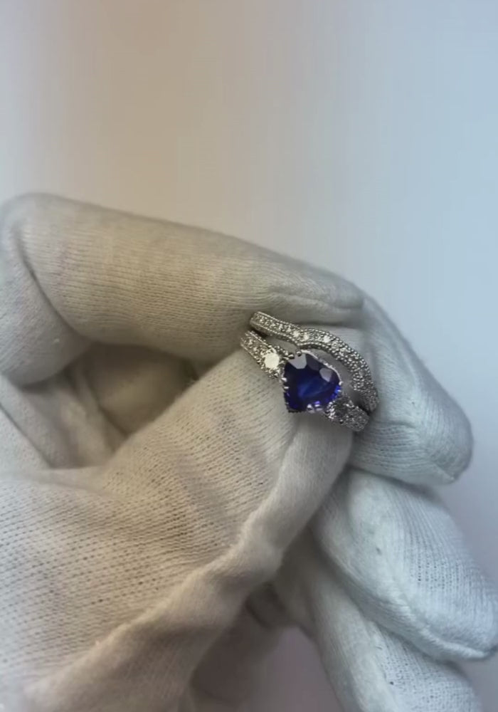 Natural Earth Mined Diamond Wedding Ring Set Heart Blue Sapphire Antique Style 3.50 Carats