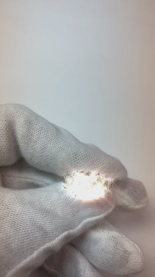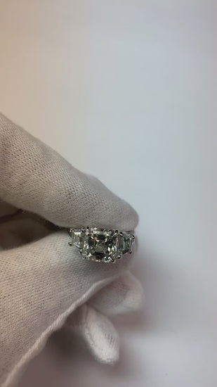 Stone Details : There is one asscher diamond approx. 4 carats (Approx. Size 8.8 x 8.8 mm), two trapezoid cut diamonds approx. 0.70 each and tapered baguettes on the sides approx. 1.50 carats. Natural earth mined diamonds.