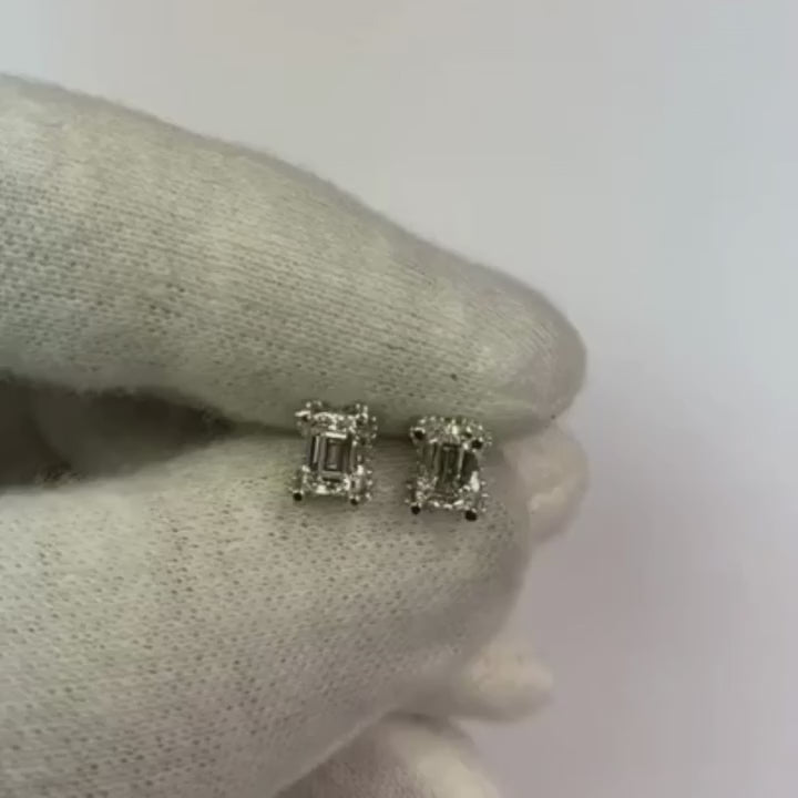 Stone Details : There is one Emerald cut diamond approx. 0.50 carats (Approx. Diameter 5 x 3.7 mm) and smaller round cut diamonds on the sides approx. 0.25 carats in each earring. Natural earth mined diamonds.