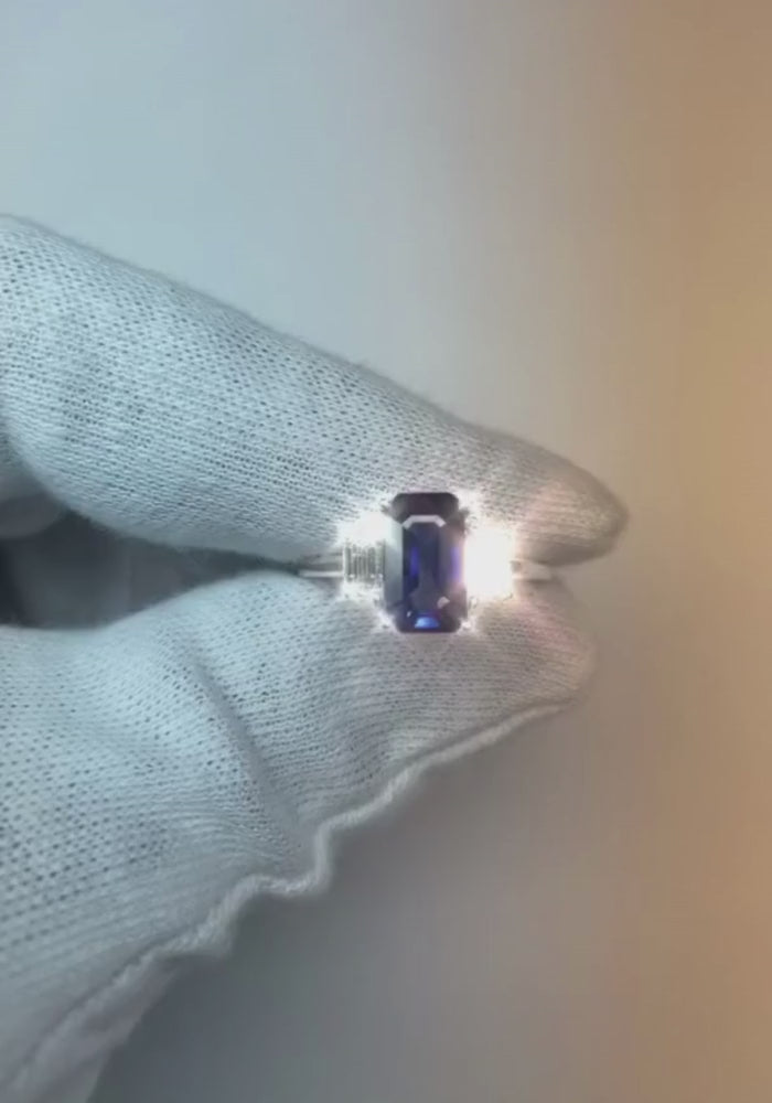 Stone Details : There is one emerald cut sapphire approx. 3 carats (Approx. Size 9 x 5 mm) and approx. 0.50 carats of diamonds on the sides. Natural earth mined stones.