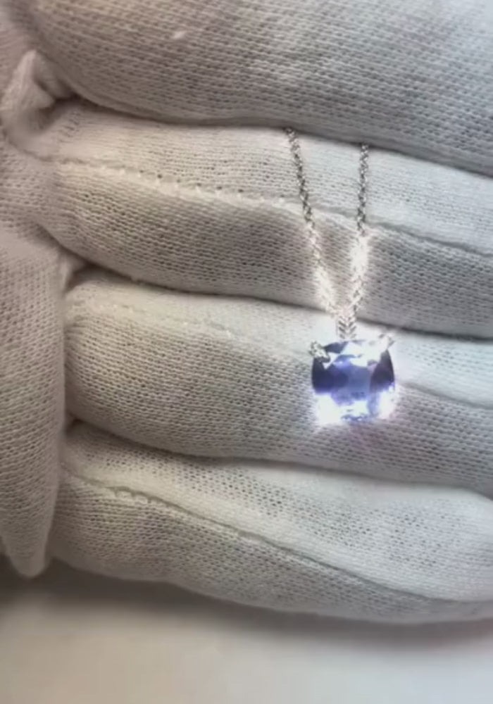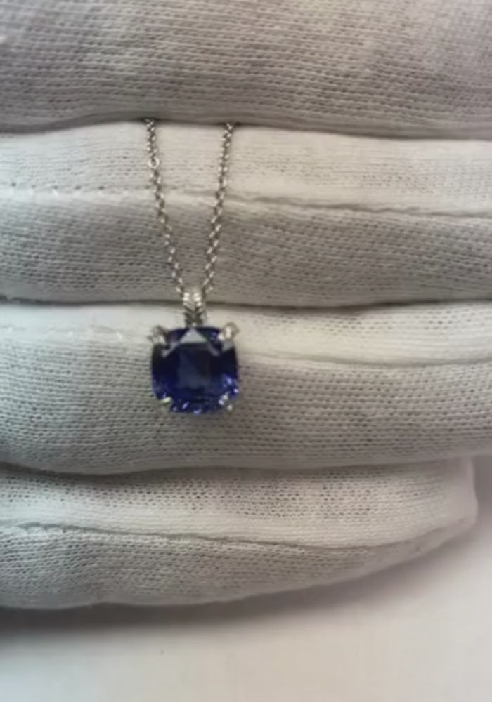 Stone Details : There is one cushion cut sapphire approx. 4 carats (Approx. Size 8.5 x 8.5 mm) and approx. 0.50 carats of smaller round diamonds on the sides in the pendant. Natural earth mined stone.