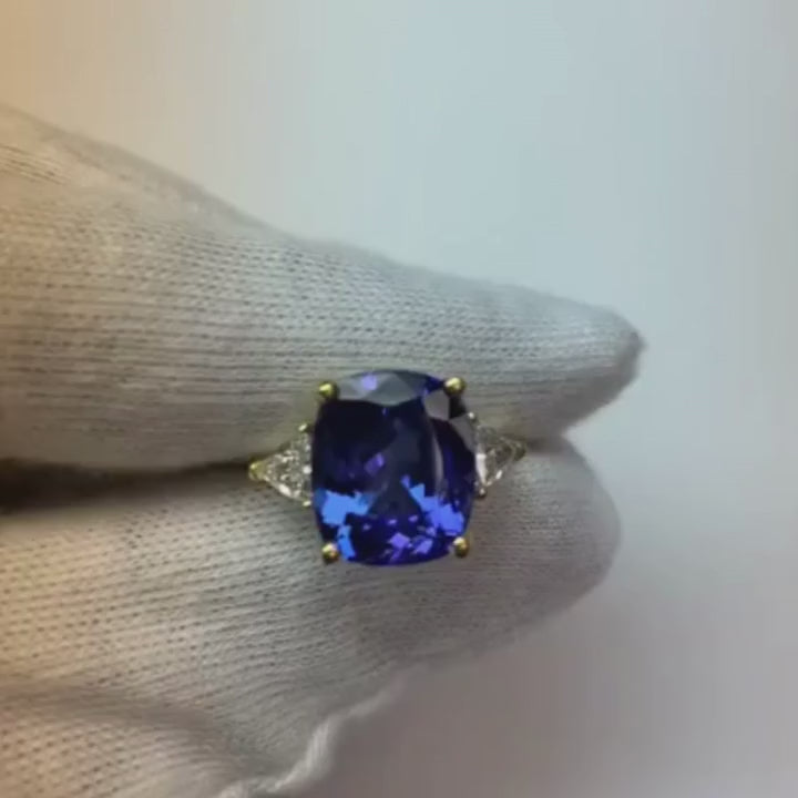 WG 14K AAA Cushion Tanzanite & Trillion Natural Earth Mined Diamonds 6.30 Ct. 3 Stone Ring