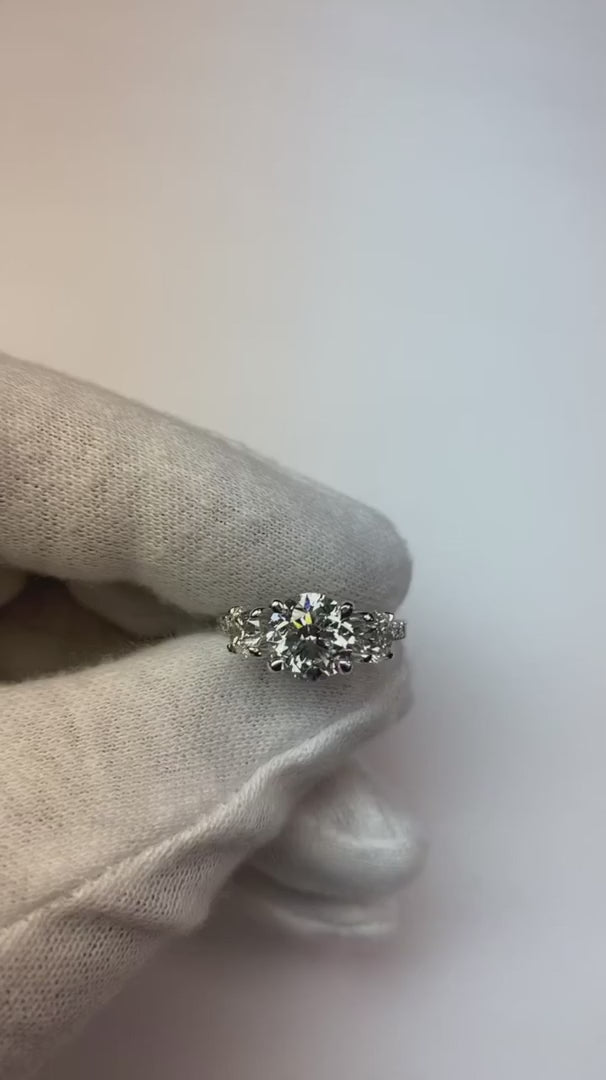 Stone Details : There is one round diamond in the center approx. 2.01 carats (Approx. Dia. 8 mm) with two diamonds on the side approx. 0.45 carats each (Approx. Dia. 4.7 mm), and approx. 0.75 carats of smaller round diamonds along along the sides. Crafted with natural earth mined diamonds.