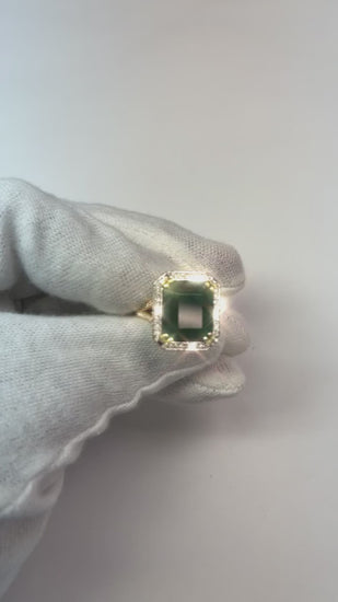 Stone Details : There is one green emerald approx. 9 carats (Approx. Size 14.8 x 10.9 mm) and approx. 2.50 carats of round diamonds on the side. Natural earth mined stones.